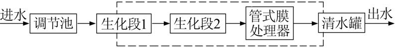 圖 1中回注水處理工藝流程中虛線部分為車載部分。工藝流程重點(diǎn)對(duì)工藝流程生化段1、生化段2、管式膜處理器詳細(xì)說明〔2, 3, 4〕,具體工藝流程見圖 2。
